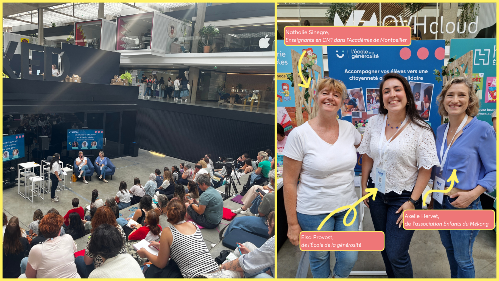 Cet atelier a permis de mettre en lumière des initiatives concrètes menées sur le terrain, grâce aux témoignages de Nathalie Sinegre, enseignante en CM1, et Axelle Hervet, porteuse du projet J’ai un rêve au sein de l’association Enfants du Mékong. Ensemble, elles ont illustré la manière dont le programme de l’École de la générosité favorise à la fois la sensibilisation des élèves à la solidarité et leur engagement dans des actions collectives porteuses de sens.